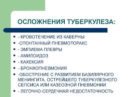 При вторичном туберкулезе развиваются обычно те же осложнения, что и при первичном. Так как туберкулез очень длительное заболевание ему часто сопутствует амилоидоз внутренних органов и тканей.