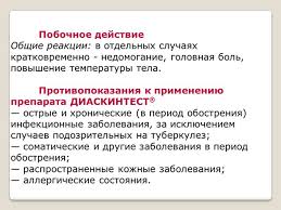 Если имеются противопоказания, то об этом стоит сообщать врачу перед тестами. При наличии документальных подтверждений (записей в карте) или клинической симптоматики проведение Диаскинтеста откладывается или отменяется.