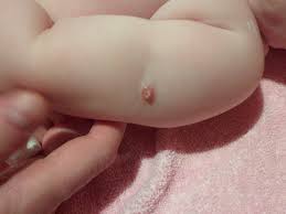 - Нарыв или небольшой гнойничок после введения средства. У некоторых новорожденных в ответ на прививку развивается небольшой нарыв, в центре которого имеется белая «головка», кожа может слегка загнаиваться и припухнуть. То, что БЦЖ гноится, вызывает панику у многих родителей, но волноваться не стоит, такая реакция может быть и у здоровых детей. С нагноением не связано с нарушением техники укола или несоблюдением правил ухода за прививкой.