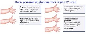 Картина может поменяться на второй день. Если реакция отрицательная, и человек не является носителем палочки Коха, то через сутки после введения Диаскинтеста на коже предплечья останется только точка от иглы, даже, если вначале было покраснение. Могут быть заметны следы рассасывающегося синяка. Что значит, если происходит обратное – там, где вчера не было ничего, обнаружено покраснение, уплотнение или даже папула?